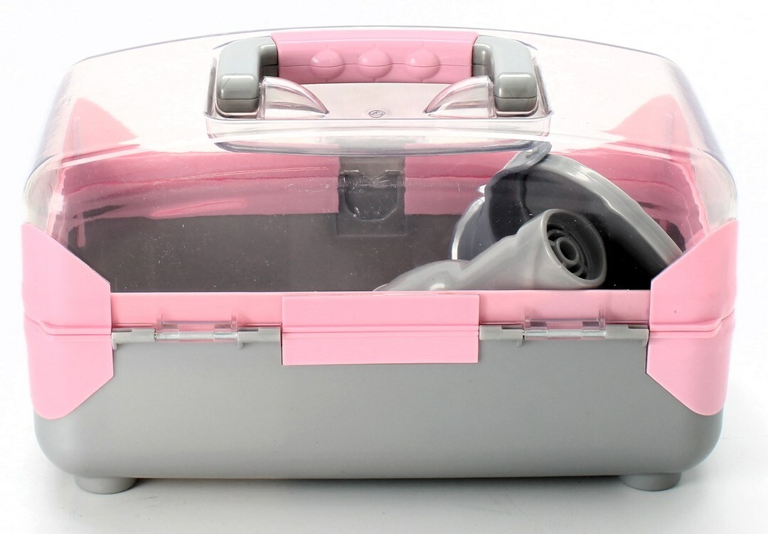 Все предметы, входящие в набор, отличаются стильным дизайном в серо-розовых тонах и изготовлены из пластика высокого качества. Чемоданчик с аксессуарами так удобно брать с собой в поездку или в гости, для этого предусмотрена специальная нескользящая ручка.