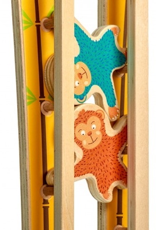 Игрушка состоит из яркой доски в стиле джунглей и пары специальных канавок. В комплекте также есть несколько деревянных обезьянок — если их поместить на вершину канавок, обезьяны будут спускаться вниз!