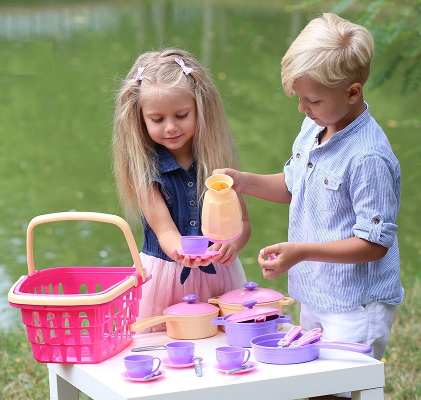 Кухонный набор во вместительной корзине - настоящая находка для маленькой хозяйки. Яркие цвета и разнообразие посуды непременно привлекут внимание малышей и родителей.