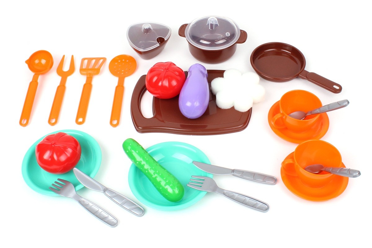 Есть кастрюлька с прозрачной крышкой (с отверстиями для прохождения пара), сковородка, доска для нарезки и яркие овощи. Две картонные коробочки с «спагетти» и «хлопьями» для приготовления полезных завтраков, а для чаепития - две чашки с блюдечками и сахарница. А после вкусного обеда - надо помыть посуду. Для этого есть мойка с краном и мочалка в форме цветочка.