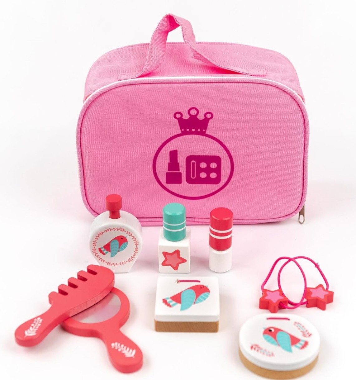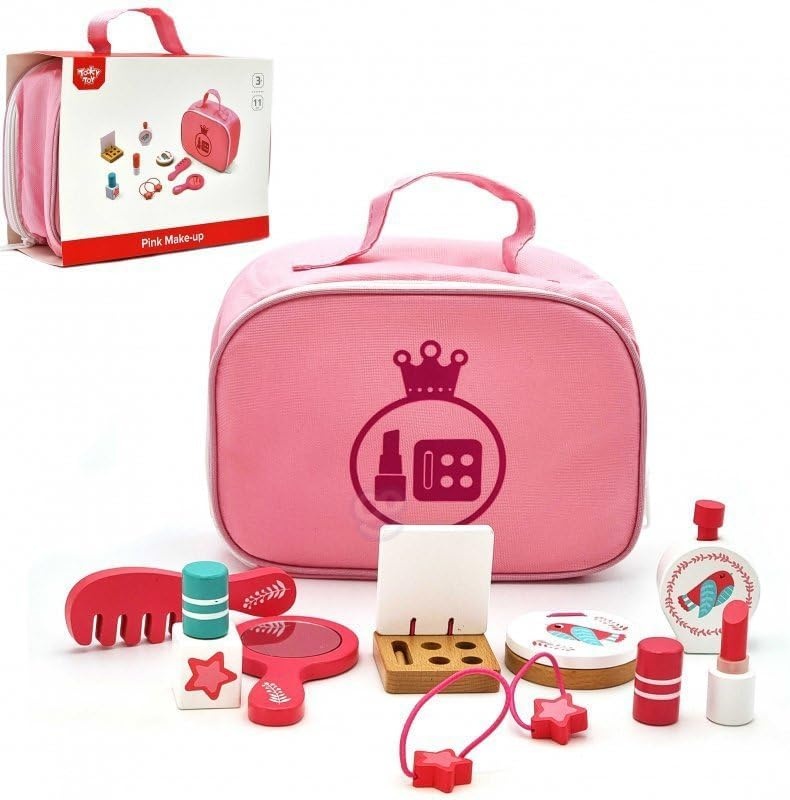 Набор игрушечной косметики для юной принцессы. В набор входит зеркальце, расческа, лак для ногтей, флакон духов, набор теней, пудра, 2 резиночки, помада и сумочка. Играя с этим набором, малышка учится чувству вкуса и стиля, постигая мир красоты и моды, развивает социальные навыки и воображение. Все предметы выполнены из высококачественного дерева, абсолютно безопасны для малышей, сумочка, резиночки и пуховка для пудры из текстиля. Для детей от 3 лет.