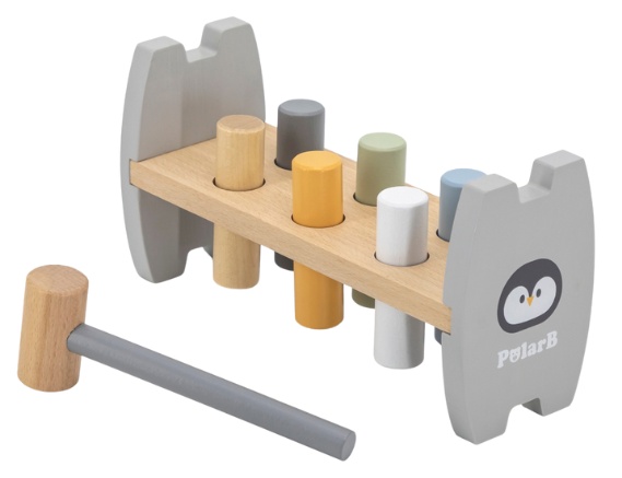 - Стучалка помогает развивать крупную моторику, так как ребенок учится удерживать молоточек и попадать им по колышкам.