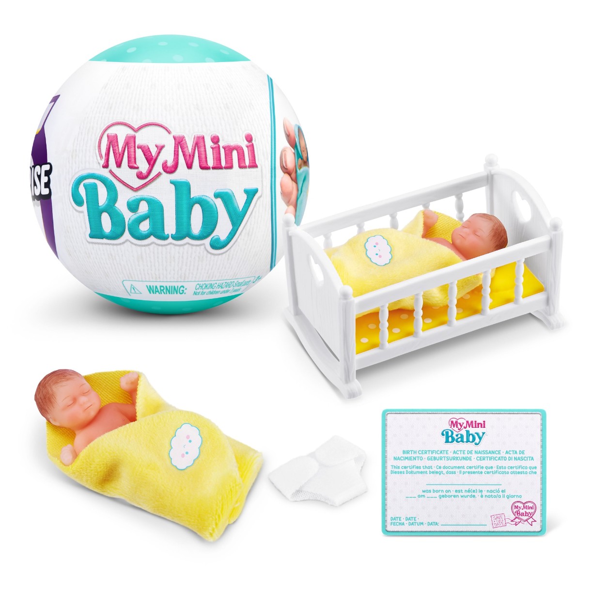 Крошки на ладошке! Такие маленькие! Такие симпатичные! Познакомьтесь с самыми милыми ультрареалистичными малышами с 5 Surprise My Mini Baby! Внутри шара вы найдёте 5 сюрпризов. Вас ждут 12 малышей. Пришло время дать имя своей очаровательной крошке и заполнить свидетельство о рождении. В комплекте также идут игровые наборы: «Время сна», «Прогулка в коляске», «Время игры» и «Смена подгузника». Какой попадётся вам?