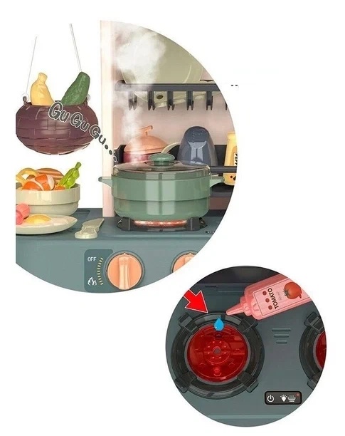 В комплект игровой детской кухни входит 43 аксессуара для готовки. Светомузыкальная вытяжка с различными звуками и мелодиями.