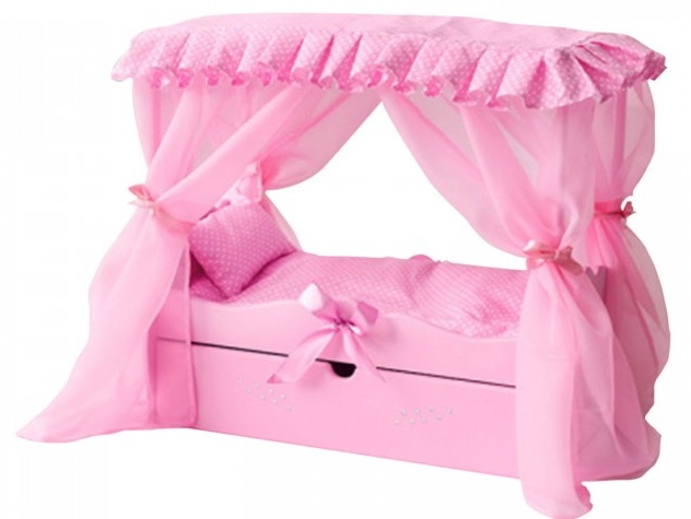 В комплекте с кроваткой поставляется нарядный и уютный баладахин, декорированный рюшами, подушка классическая, подушка-валик с нарядными лентами, увеличенное одеяльце, мягкий матрасик. Все постельное белье изготовлено из 100% хлопка. Также в комплект входят стразы.
