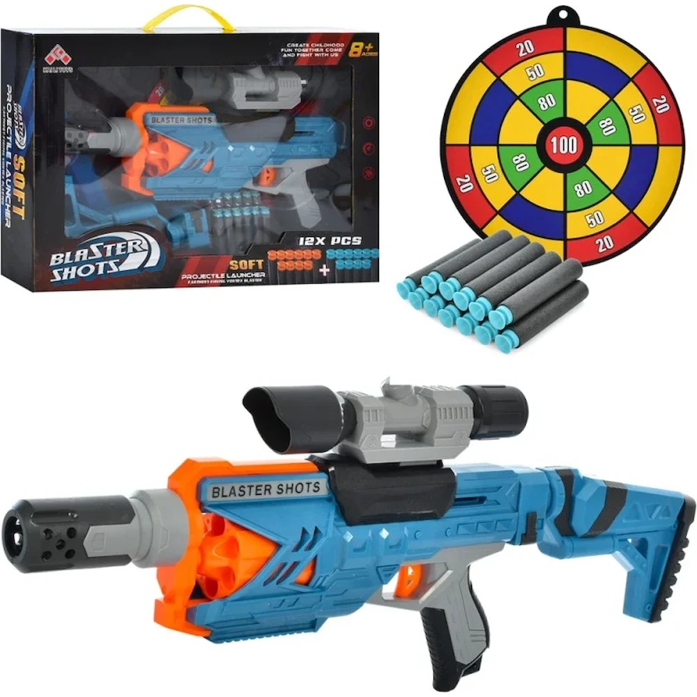 В комплект входит большая мишень высотой 58 см, в которую можно стрелять мягкими пулями-присосками. Они имеют продуманную конструкцию и легко прикрепляются к поверхности, делая игру ещё более реалистичной и интересной.