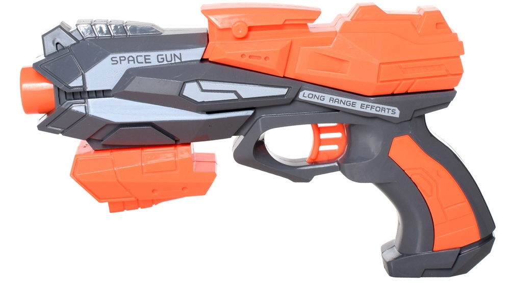 В наборе: бластер, мягкие пули 5 штук, мишень 3 штуки. Дальность выстрела составляет порядка 10 метров. Изделие изготовлено из пластмассы. Рекомендованный возраст: 6 +.