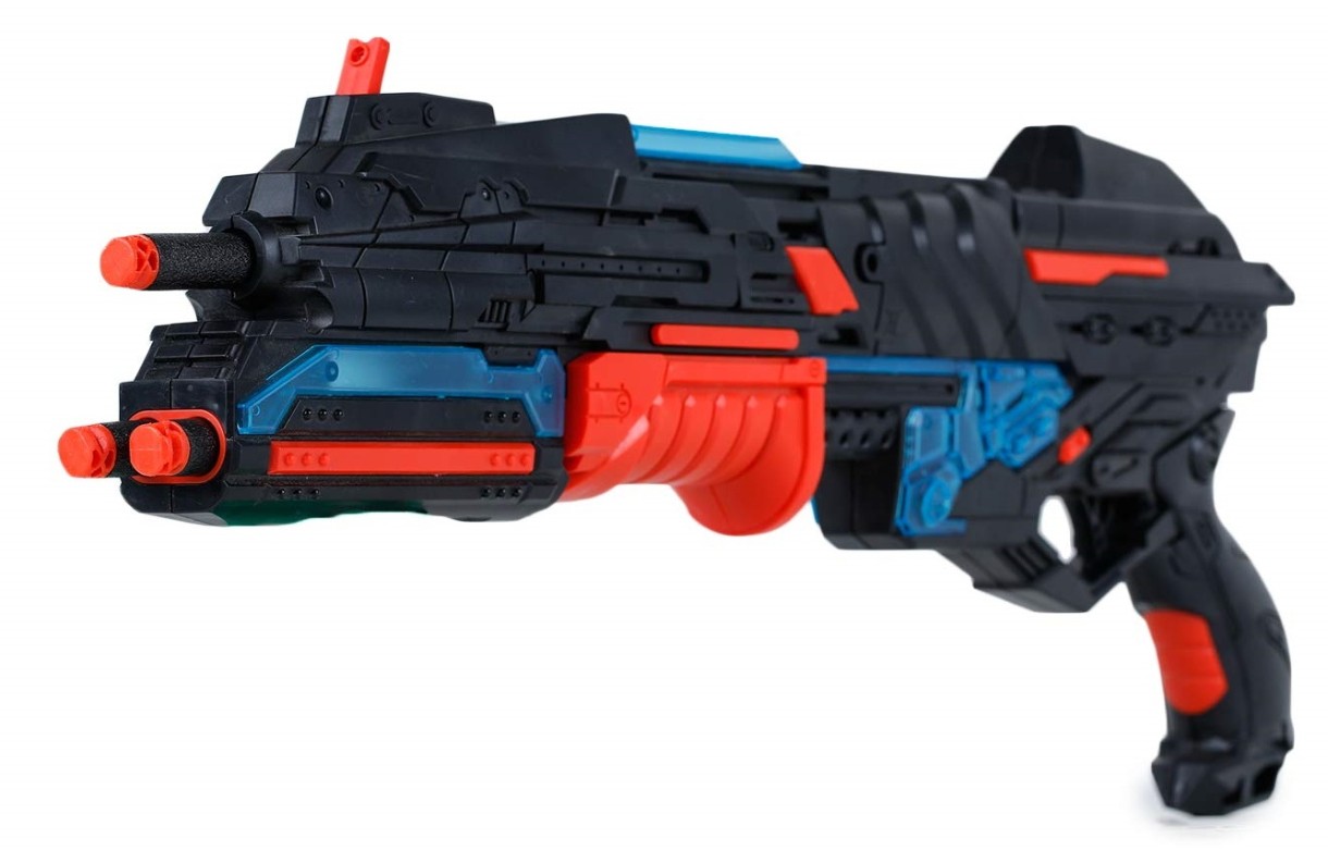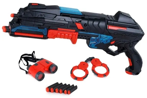 Набор включает в себя крутой бластер в черно-красном корпусе с футуристичным дизайном, а также набор мягких поролоновых пуль, которые не нанесут травм при игре. Для более разнообразной и реалистичной игры, в набор входит держатель для патронов, крепление держателя, а также бинокль и наручники с ключами.