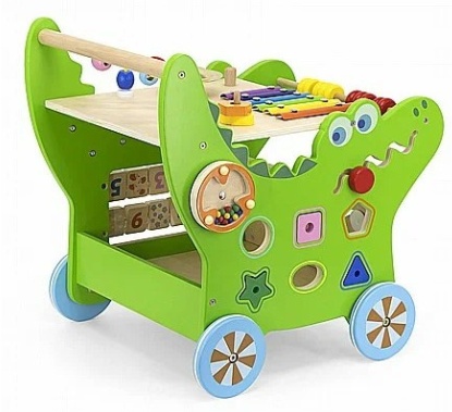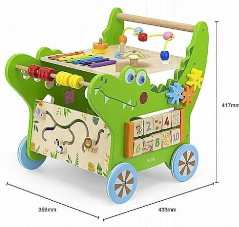 Деревянные ходунки VIGA содержит полный набор увлекательных занятий для малыша: лабиринт животных, ксилофон, шестеренки, сортировщик фигур, счеты и многое другое.