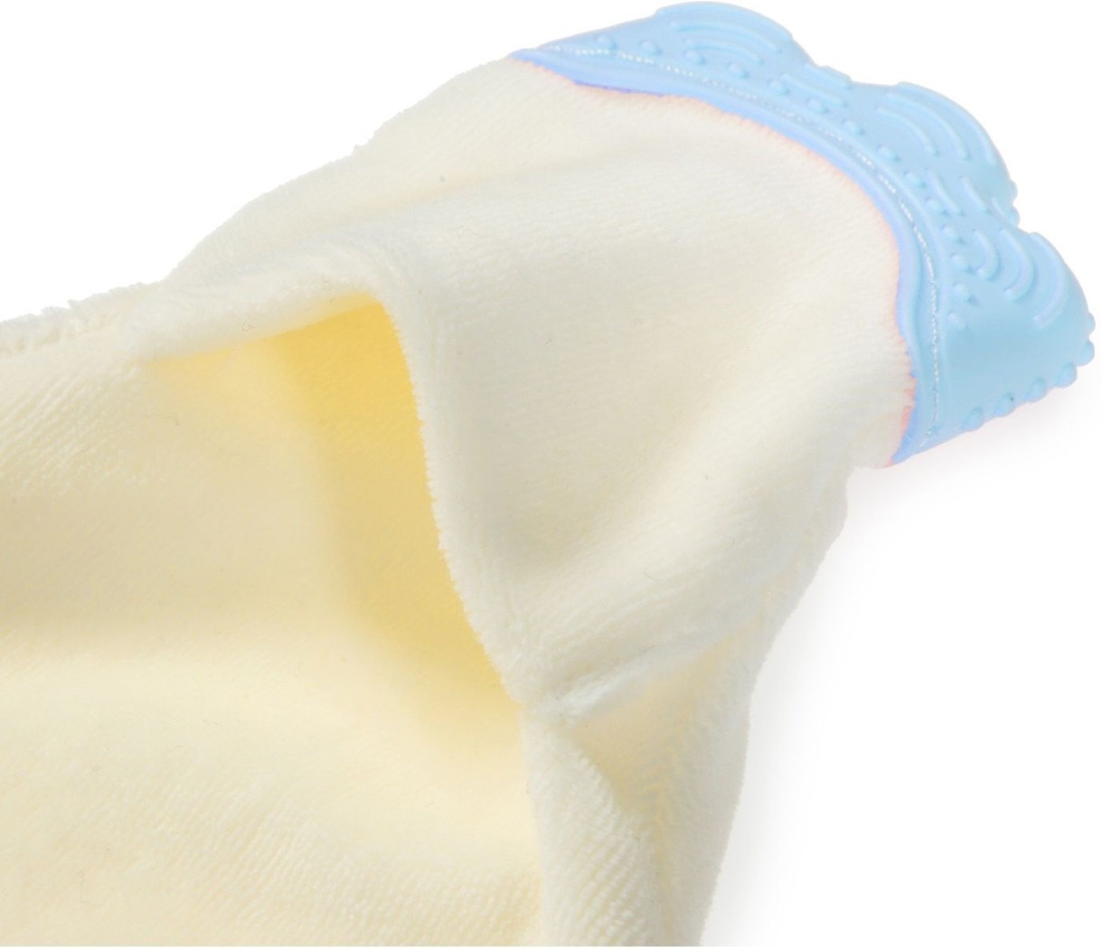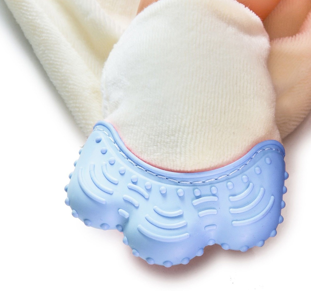 К одному из концов игрушки прикреплена мягкая силиконовая перчатка, которая помогает снять боль в деснах и защищает малыша от царапин.