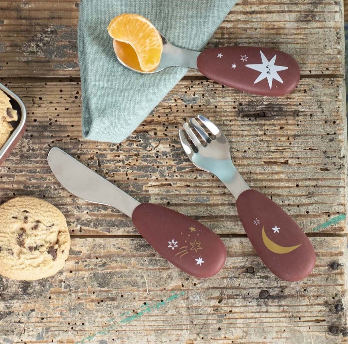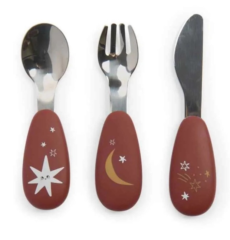 Набор из 3 столовых приборов из нержавеющей стали и силикона с удобной ручкой — чтобы есть, как взрослый. Подходит для мытья в посудомоечной машине. С милыми иллюстрациями «Après la pluie».