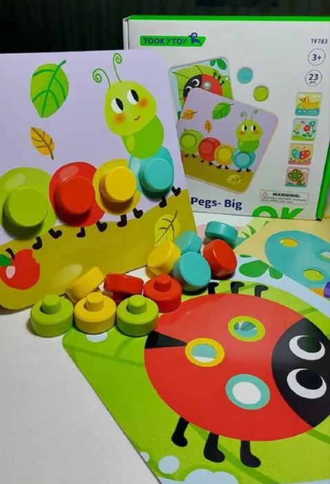 Деревянная Мозаика от Tooky Toy для самых маленьких приведет в восторг вашего ребенка. Комбинируя яркие разноцветные детали, малыш собирает изображения на карточках и изучает цвета. В наборе 16 больших деревянных гвоздиков, 6 иллюстрированных картинок и деревянная основа. Игры с мозаикой способствуют развитию мелкой моторики и зрительно-моторной координации. Обучают малыша формам и цветам, развивают логику, пространственное восприятие. Набор продается в красочной упаковке и идеален для подарка. Крупная мозаика из дерева с яркими персонажами, подходит для малышей с самого раннего возраста. Красивая и полезная, она идеально подойдет для подарка, и безусловно, вызовет интерес у любого малыша. Сортер представляет собой набор игрушек, созданных специально для развития моторики, логического мышления и воображения, подготовить руку к письму, развить пинцетный захват. Детская мозайка позволит ребенку изучать по карточкам различные предметы, оттенки и развивать пространственное мышление и воображение. Кому еще эта мозаика по душе? Родителям, которые ценят удобство - ведь ламинационные карточки не рвутся и не испачкаются. Обучающие пособие для педагогов в работе. Игра в подарочной, яркой и прочной упаковке подходит для коллективных подарков в детский сад.