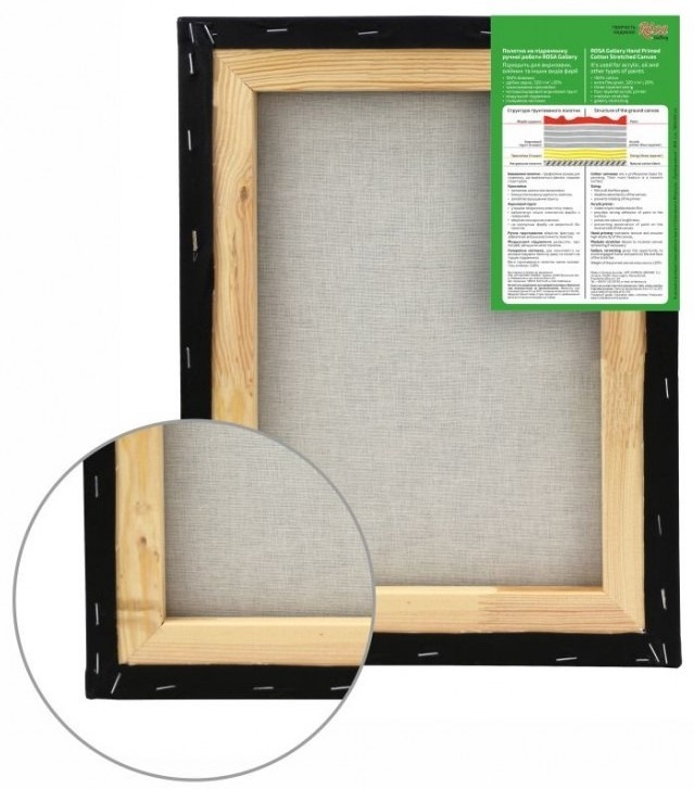 Полотно хлопковое на подрамнике ручной грунтовки ROSA Gallery - основа для живописи, изготовленная из натурального хлопкового полотна, натянутая галерейным способом на модульный подрамник из клееной сосны. Оно подходит для акриловых, масляных и других видов красок. Хлопковое полотно является более мягким и эластичным, чем лен, и имеет менее выраженную текстуру, что идеально для классической живописи.