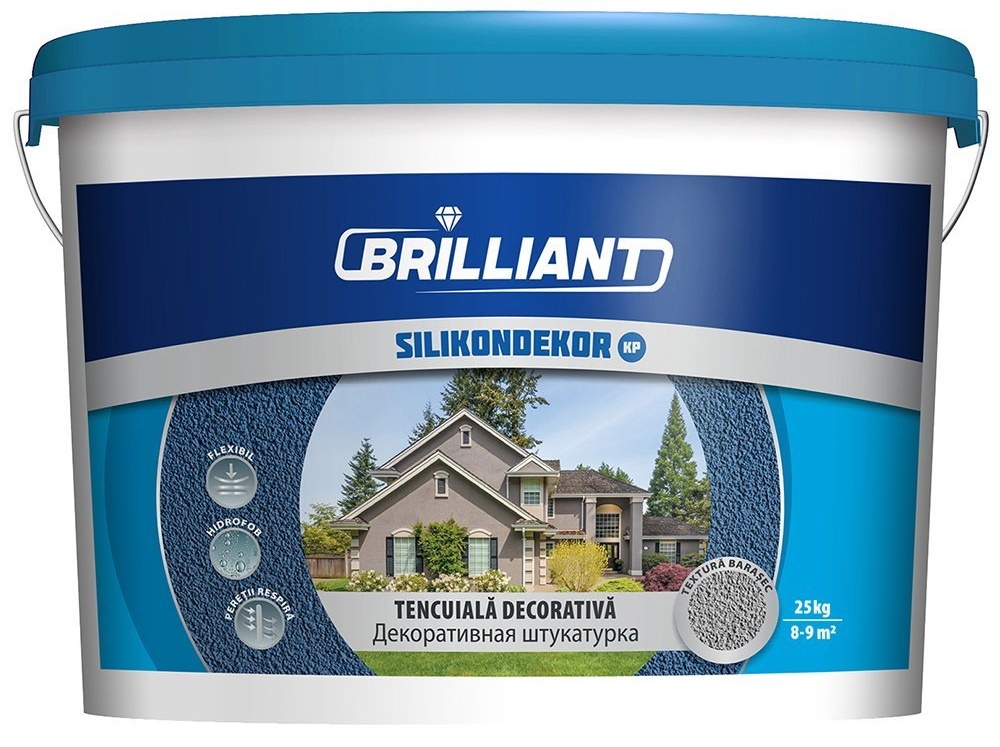 Декоративная штукатурка с силиконовой добавкой Silikondekor KP — декоративная штукатурка, твердая, матовая, структурированная, используется при внутренних и наружных отделочных работах; декоративная штукатурка на основе синтетической смолы, с добавлением силиконизированного латекса и минеральных наполнителей, размер гранул 1,5 мм; вид массы — однородная паста; доступна для компьютерной колеровки используя исключительно рецепты и пигменты BRILLIANT COLOR; наносится на любое минеральное основание: обычные известкого-цементные штукатурки, гипсовые шпатлевки, бетон, гипсокартонные листы и старые окрашенные поверхности стойкие к трению и истиранию.