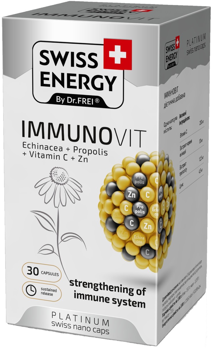 Swiss Energy, Витамины Иммуновит, Нано Капсулы, являются витаминами для укрепленя иммунитета. Эхинацея известна как одна из са- мых полезных трав, укрепляющих иммунную систему. Пропо- лис является натуральным антибиотиком, уничтожает вредные бактерии, не затрагивая полезную флору. Витамин С и Цинк ока- зывают сильное антиоксидантное действие. Повышает сопротивляемость организма к инфекциям.