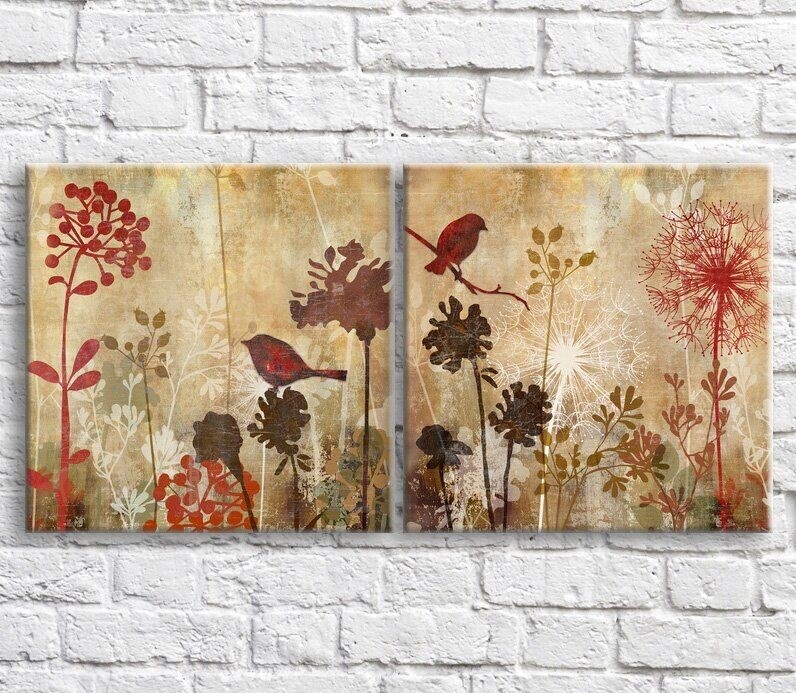 Картина ArtPoster Wildflowers and birds in vintage style, graphics, diptych (3467757)