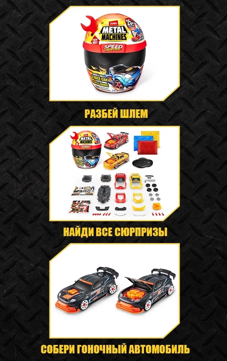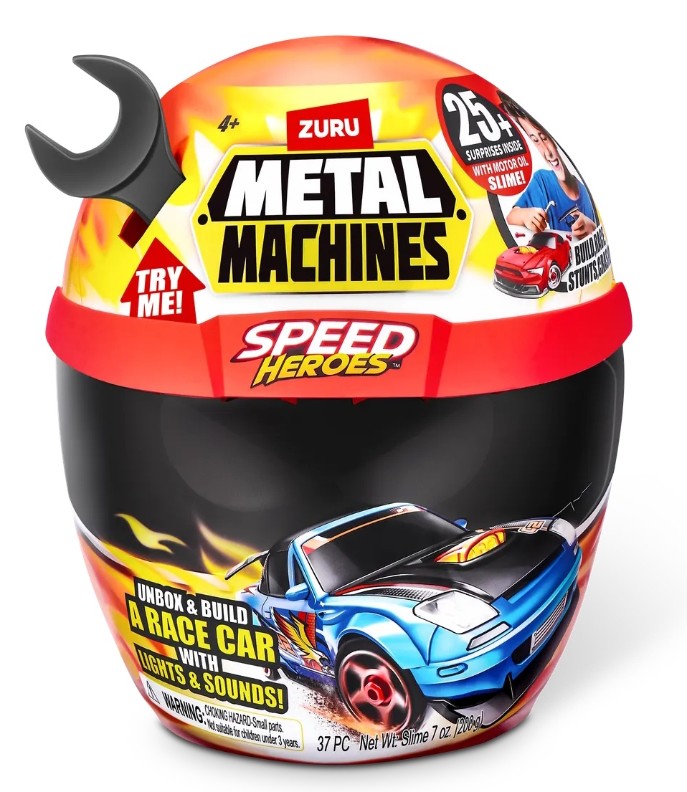 Погрузитесь в мир скорости и азарта с Metal Machines Speed Heroes! В этом невероятном игровом наборе вас ждет увлекательное приключение: раскройте гоночный шлем и обнаружьте внутри более 20 сюрпризов, позволяющих создать неповторимый гоночный автомобиль. Собирайте детали, разрабатывайте дизайн и кузов своей машинки, искрите энергией света и звуков! Соревнуйтесь с друзьями на гоночной трассе и узнайте, кто станет главным героем скорости. Ощутите азарт гонок с Metal Machines Speed Heroes!