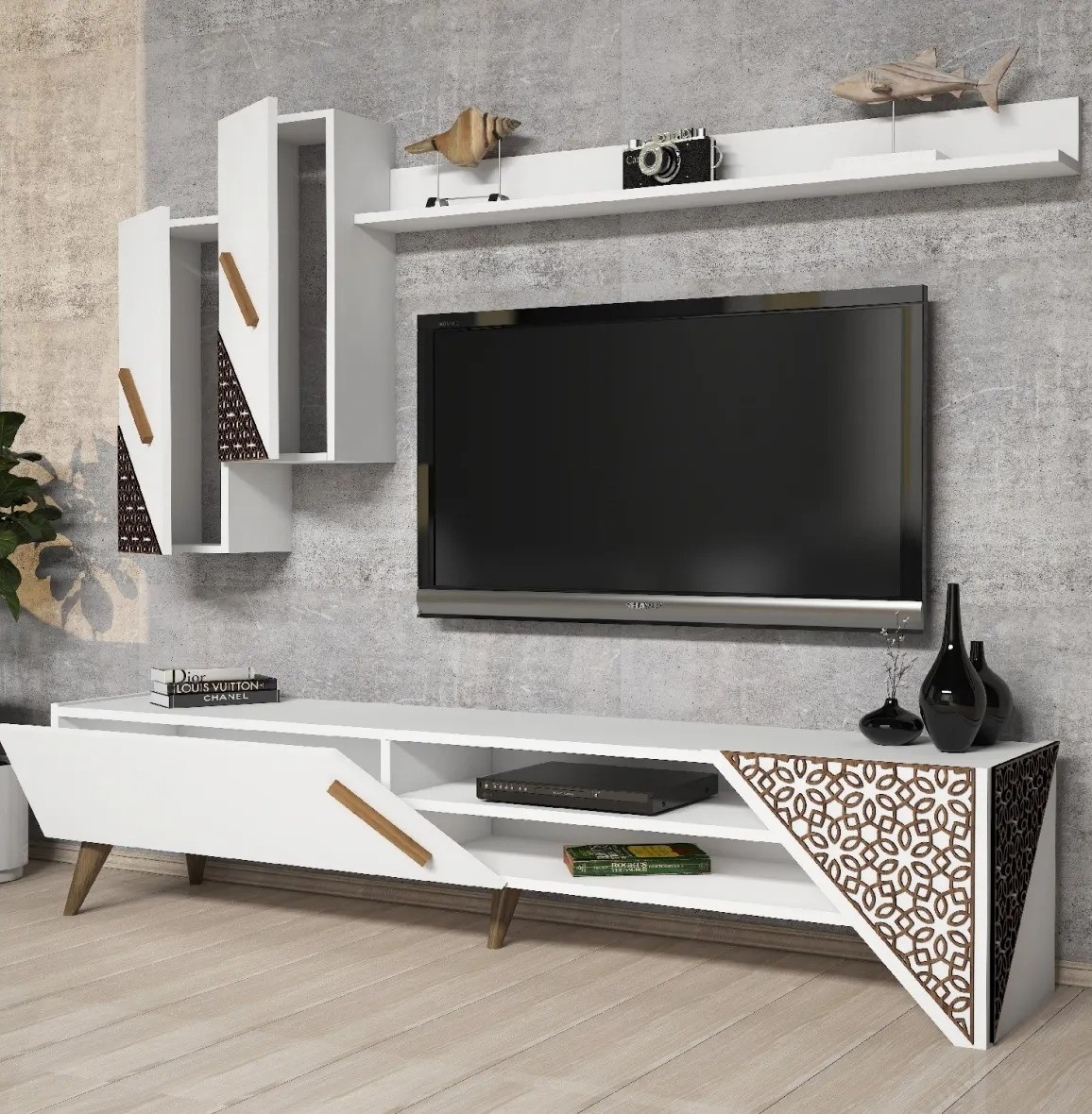 Ощутите идеальное сочетание стиля и функциональности с современным комплектом для гостиной. Изготовленный из древесных плит, покрытых меламином, этот набор создан для долговечности и стойкости к ежедневной эксплуатации. Толщина 18 мм обеспечивает прочность и устойчивость, а декоративная обработка CNC придаёт мебели утончённый вид.