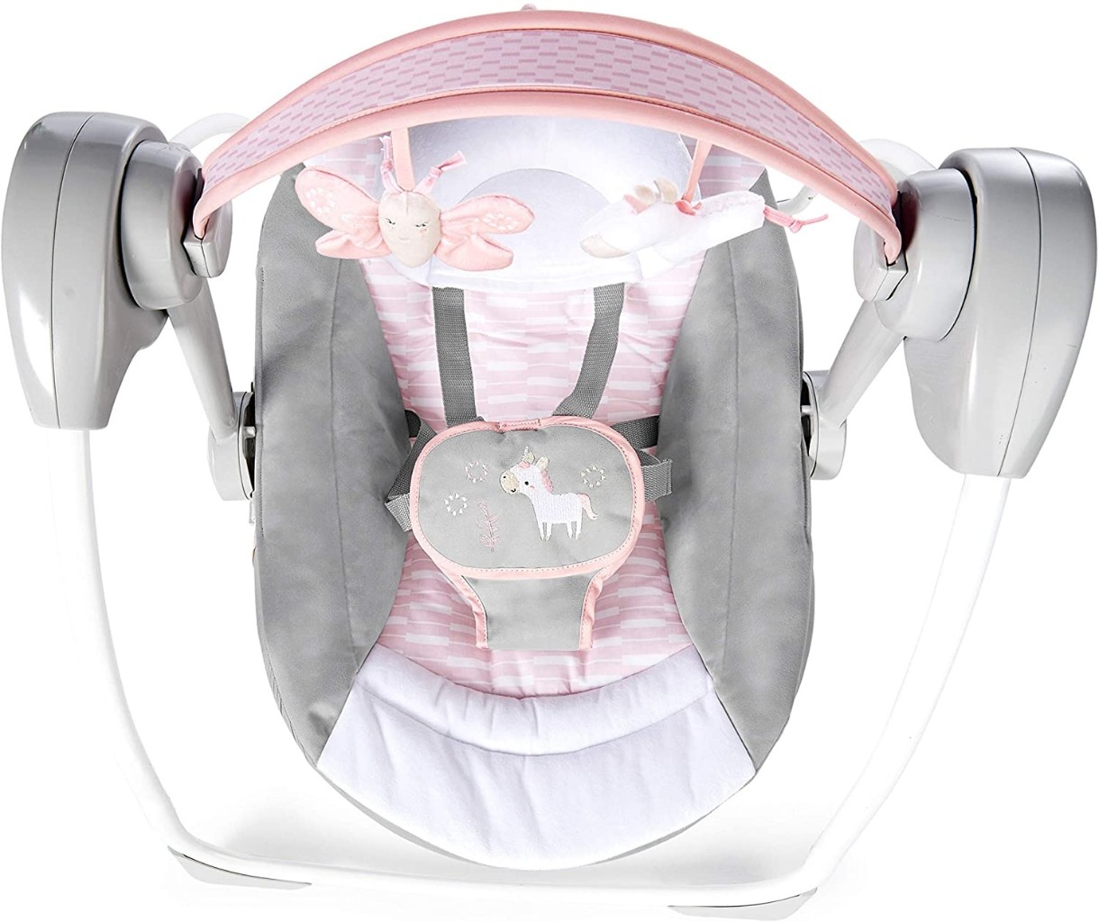 Компактная складная конструкция маленьких качелей делает их идеальными для путешествий. Мягкие подножки и боковые опоры обеспечивают оптимальный комфорт для вашего ребенка. Вы сможете сохранять спокойствие, зная, что ребенок в безопасности, благодаря ремню безопасности, регулируемому в 5 точках. Розовый дизайн и игрушки с бабочками и единорогами делают его идеальными качелями для вашей маленькой девочки.