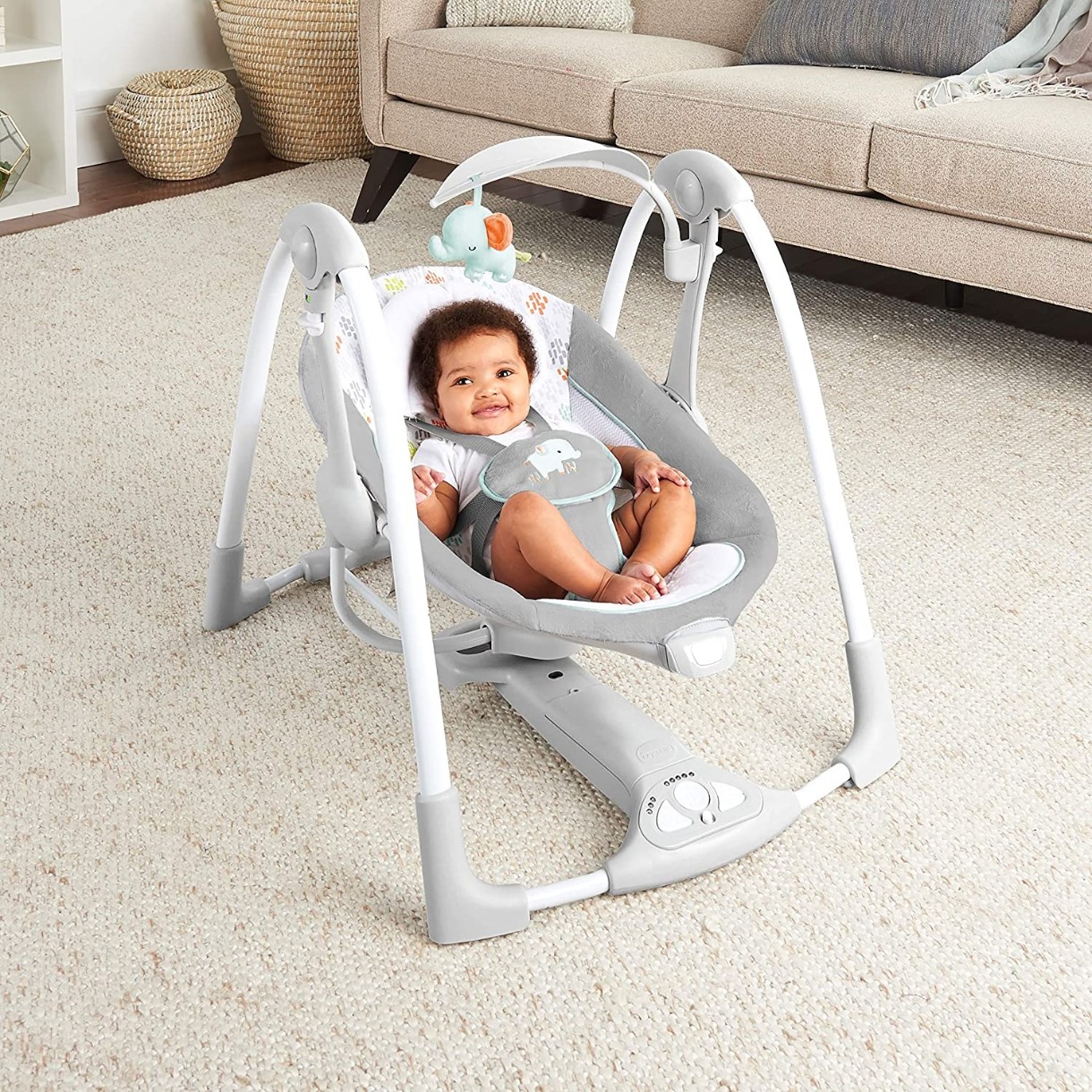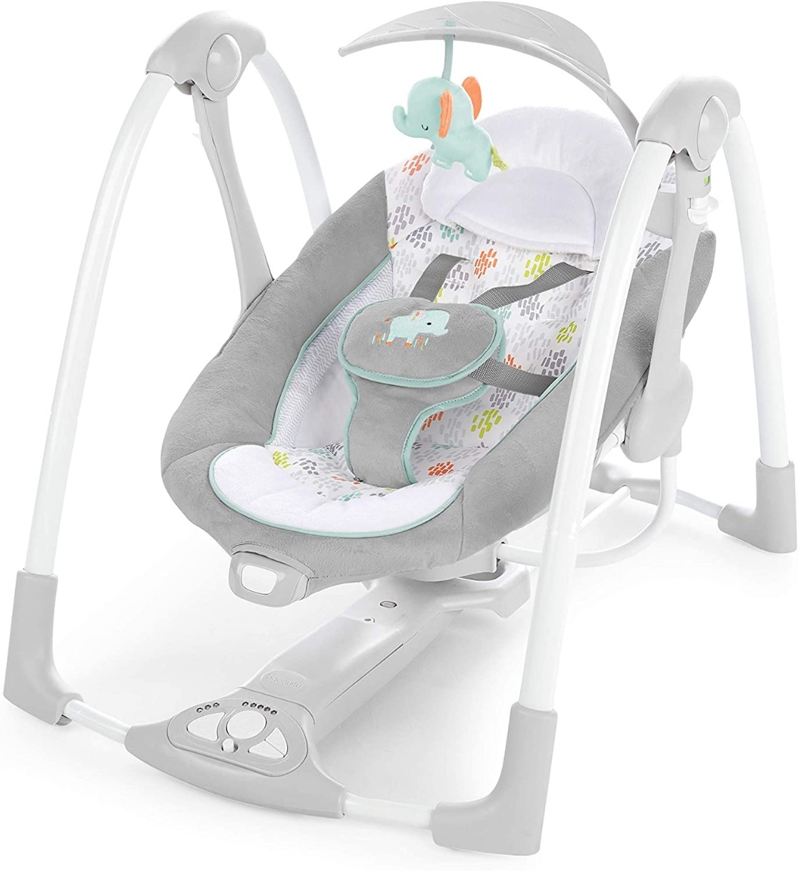 5-ти точечный ремень гарантирует высокий уровень безопасности. Антискользящее покрытие на ножках обеспечивает устойчивость на любой поверхности. Качели складываются в небольшую конструкцию, они не занимают много места при хранении, их удобно взять с собой в поездку.