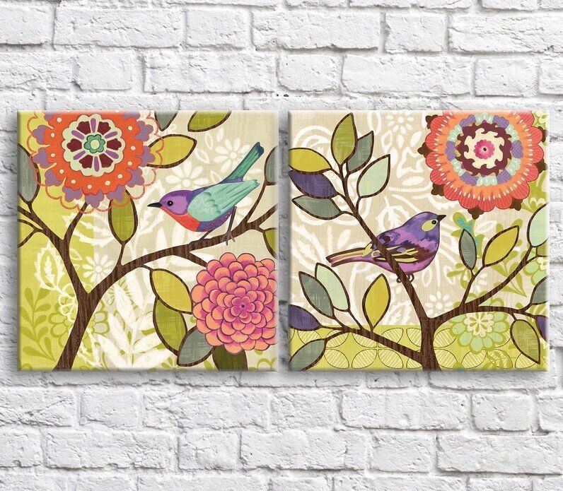 Картина ArtPoster Birds and Pink flowers on a Green background (3467764)