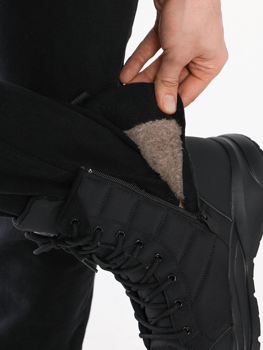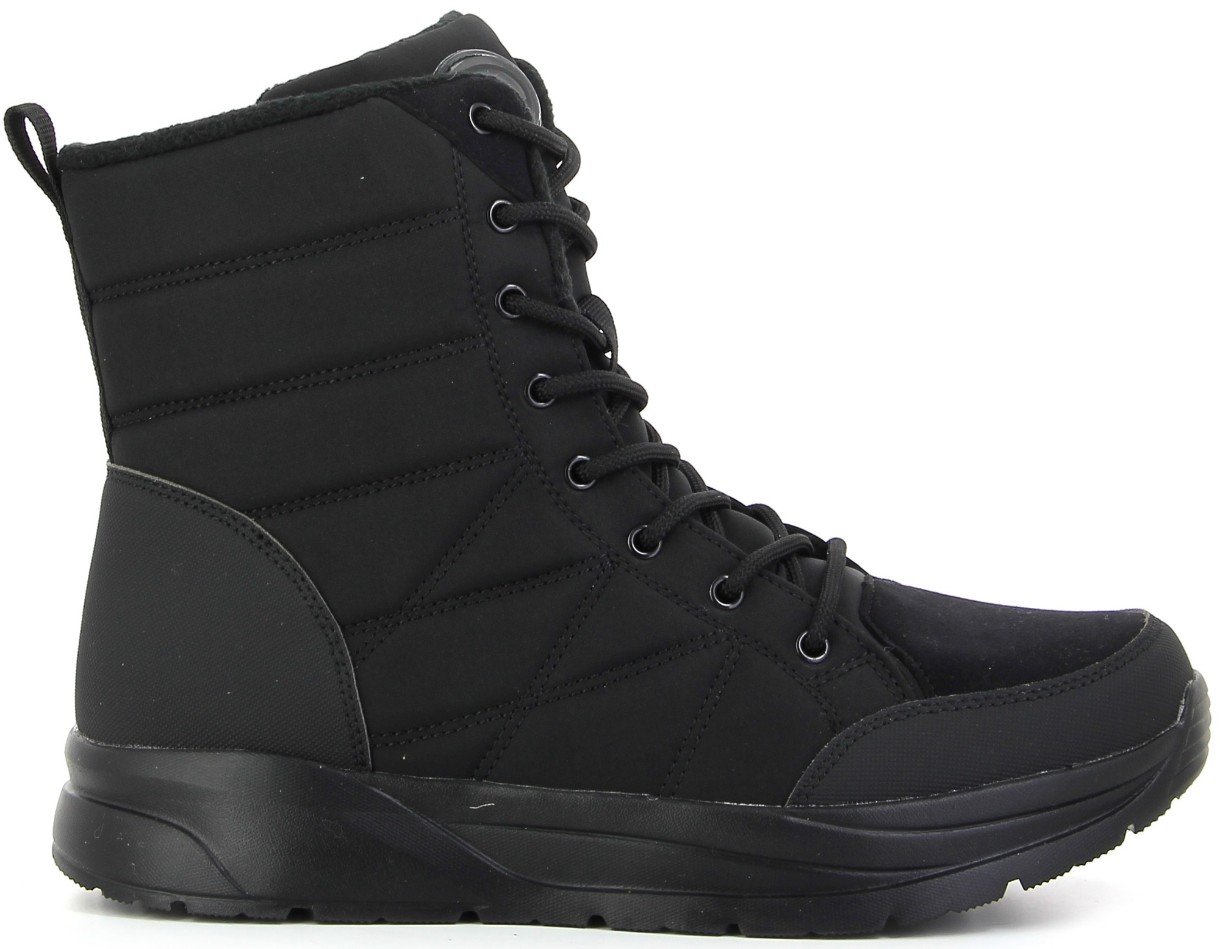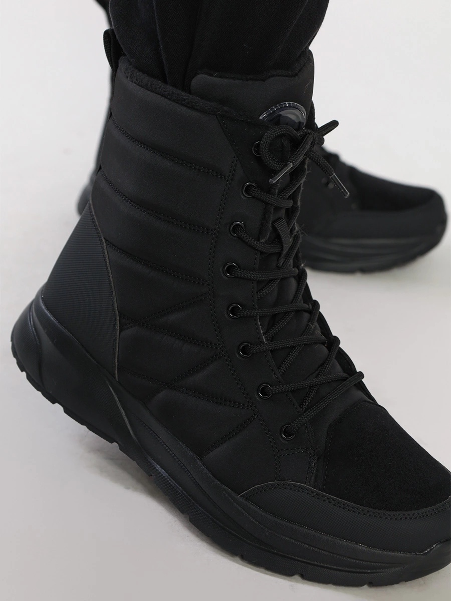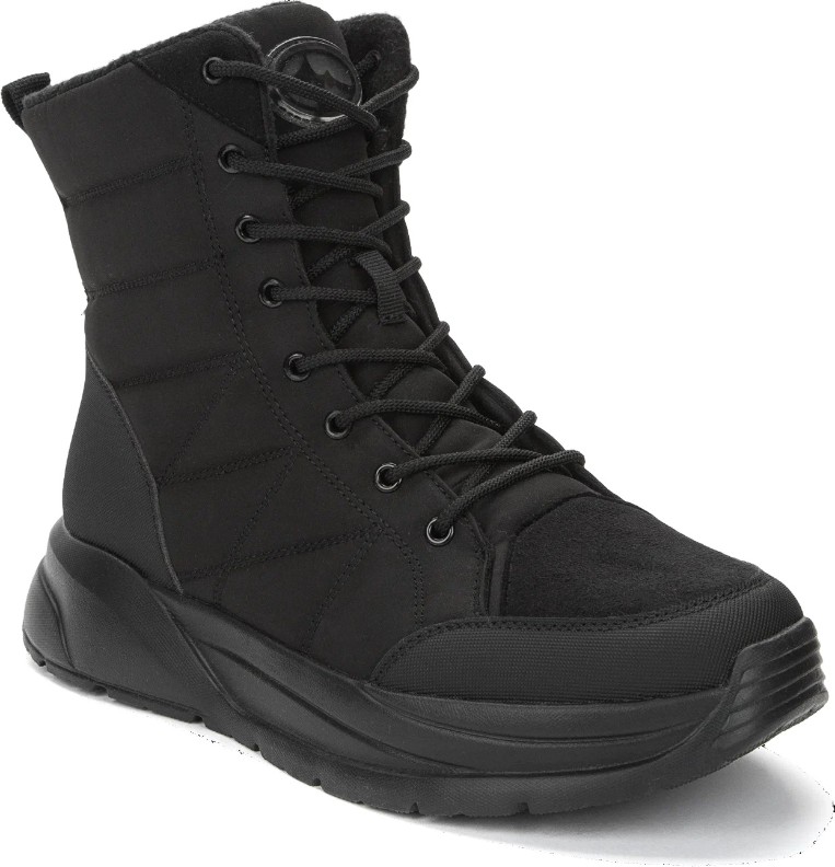 Удобные практичные ботинки универсального черного цвета идеально впишутся в зимний гардероб. Модель выполнена из текстильного материала со специальным покрытием, которое защищает обувь от влаги и ветра, и украшена модной фактурной строчкой. Подкладка из натуральной шерсти надежно сохраняет тепло. Подошва с амортизацией обеспечивает комфорт в любую погоду.