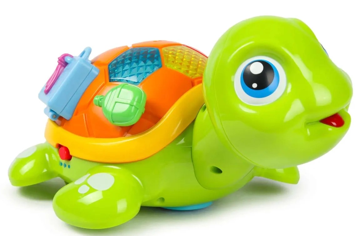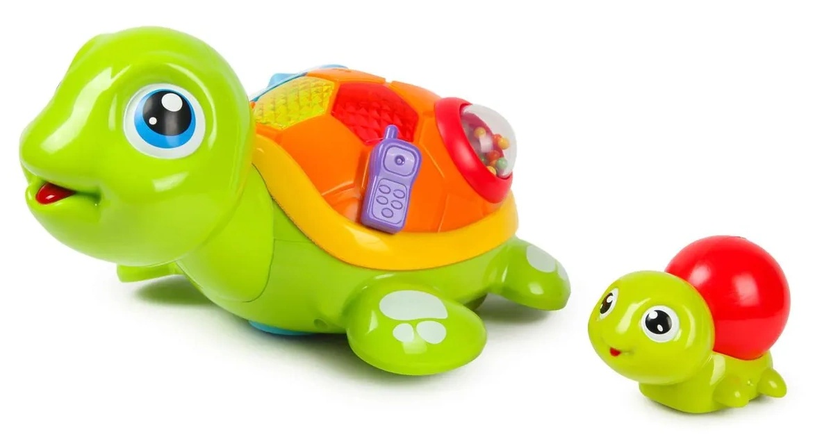 Игрушка Hola Черепаха –интерактивное развлечение для самых маленьких! Фигурка представляет собой большую мама-черепаху, на спине которой есть множество различных развлечений и место для ее малыша. Игрушка умеет ползать по полу, и, если вдруг, черепашонок падает, то мама-черепаха останавливается. Также она умеет произносить разнообразные фразы и мигать лампочками на панцире. Если приставить малыша носиком к хвостику мамы, то они начнут двигаться вместе.