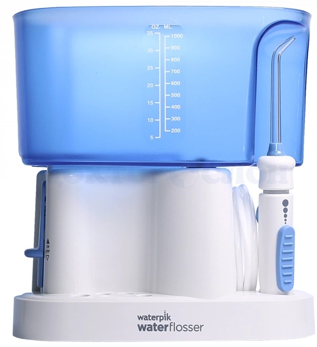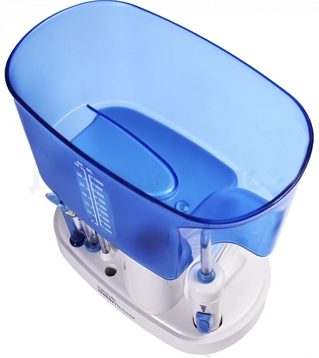 Стационарный ирригатор, работает от сети. Идеальный вариант для использования всей семьей. Рабочее давление от 35 до 620 кПа. В комплекте четыре насадки. Резервуар на 1000 мл.