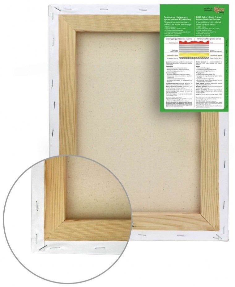 Полотно хлопковое на подрамнике ручной грунтовки ROSA Gallery - основа для живописи, изготовленная из натурального хлопкового полотна, натянутая галерейным способом на модульный подрамник из клееной сосны. Оно подходит для акриловых, масляных и других видов красок. Хлопковое полотно является более мягким и эластичным, чем лен, и имеет менее выраженную текстуру, что идеально для классической живописи.