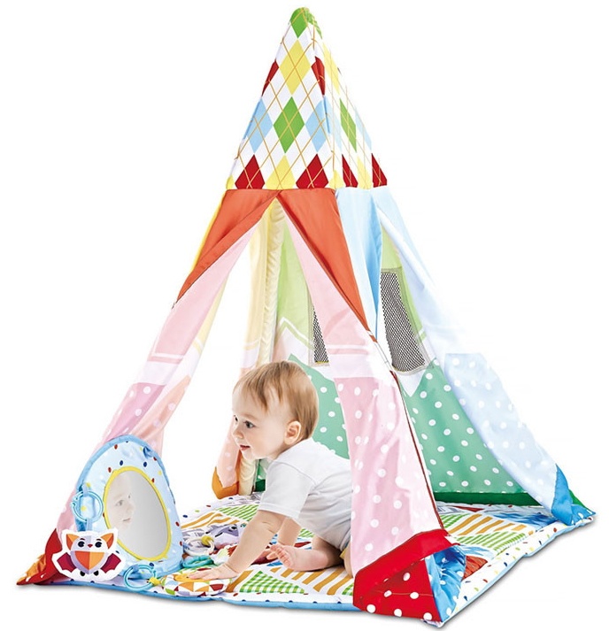 Коврик-шатёр лагерь для активного отдыха красочный и привлечет внимание вашего ребенка. Первое время игровой коврик можно использовать для занятий и игр малыша, так как он оснащен панелью с 4 интересными и красочными подвесными игрушками. Впоследствии игровой коврик можно использовать как лагерь, где ваш малыш будет играть часами. Его можно использовать дома, на улице, на пляже или в любом другом месте, где находится ваш ребенок. В наборе 20 маленьких мячей.