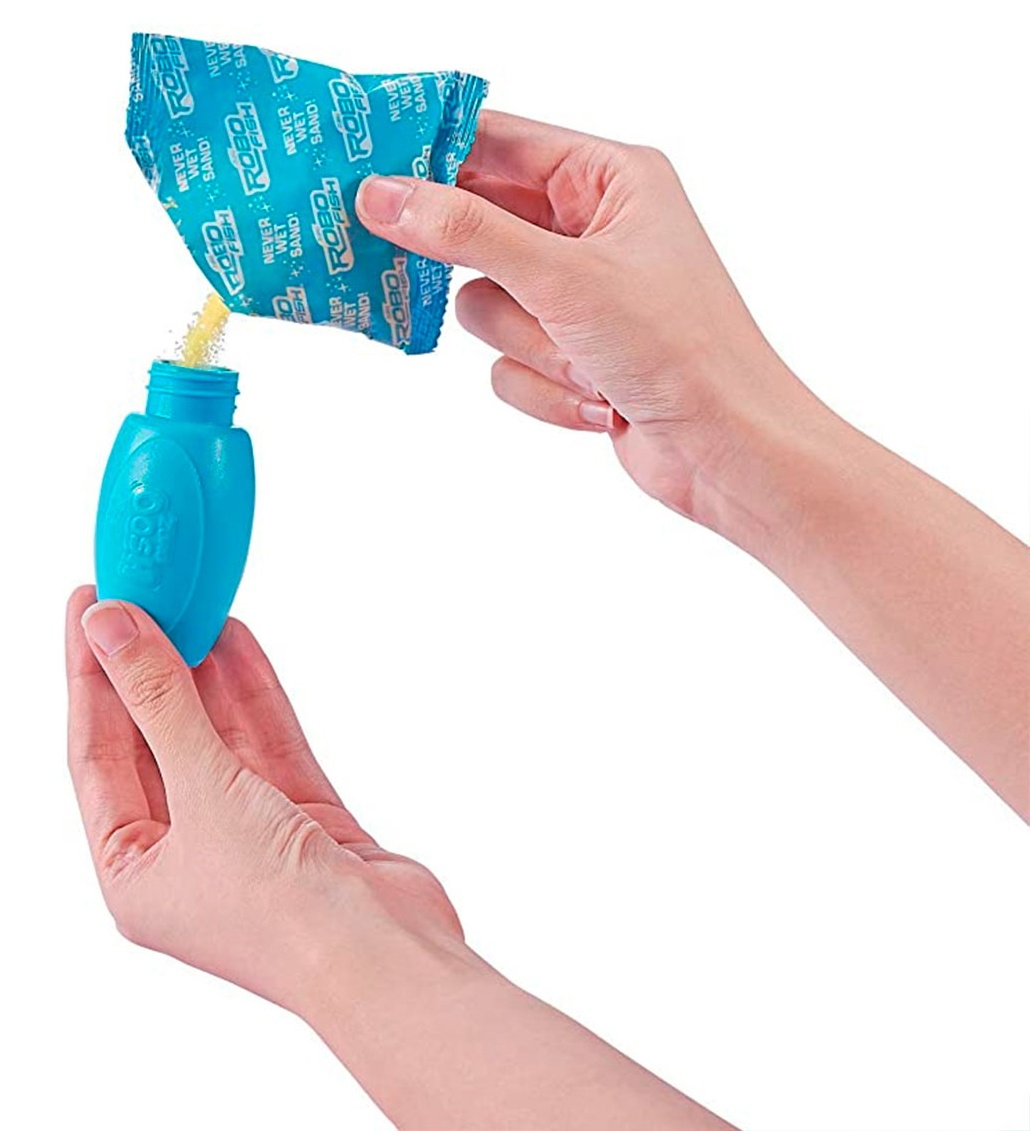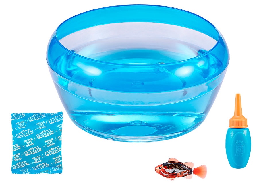 В комплект входит рыба-робот; аквариум и бутылка гидрофобного песка.