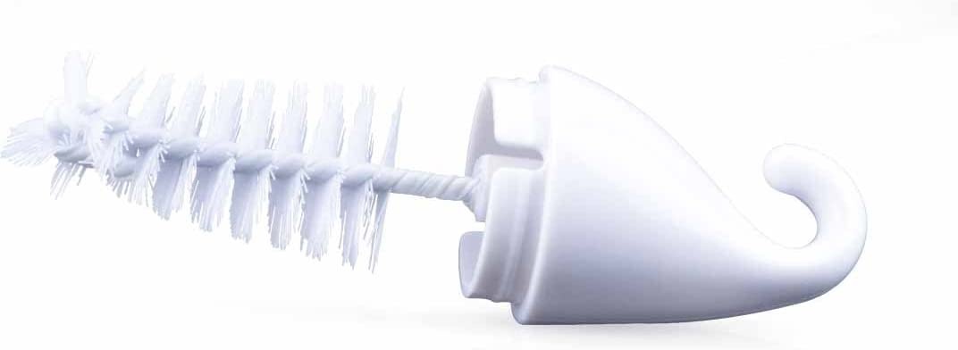 Изделие состоит из ершика для мытья бутылочек и щеточки для мытья сосок. Щеточка для мытья сосок удобно встроена в вентиляционную полость ручки ершика. Вентиляция полости, в виде забавного мишки, обеспечивает полное высыхание щеточки. Изогнутая форма ершика удобна в использовании. Мягкая долговечная нейлоновая щетинка позволит без труда избавиться остатков пищи. Губка на конце ершика эффективно вычистит наиболее труднодоступные места.