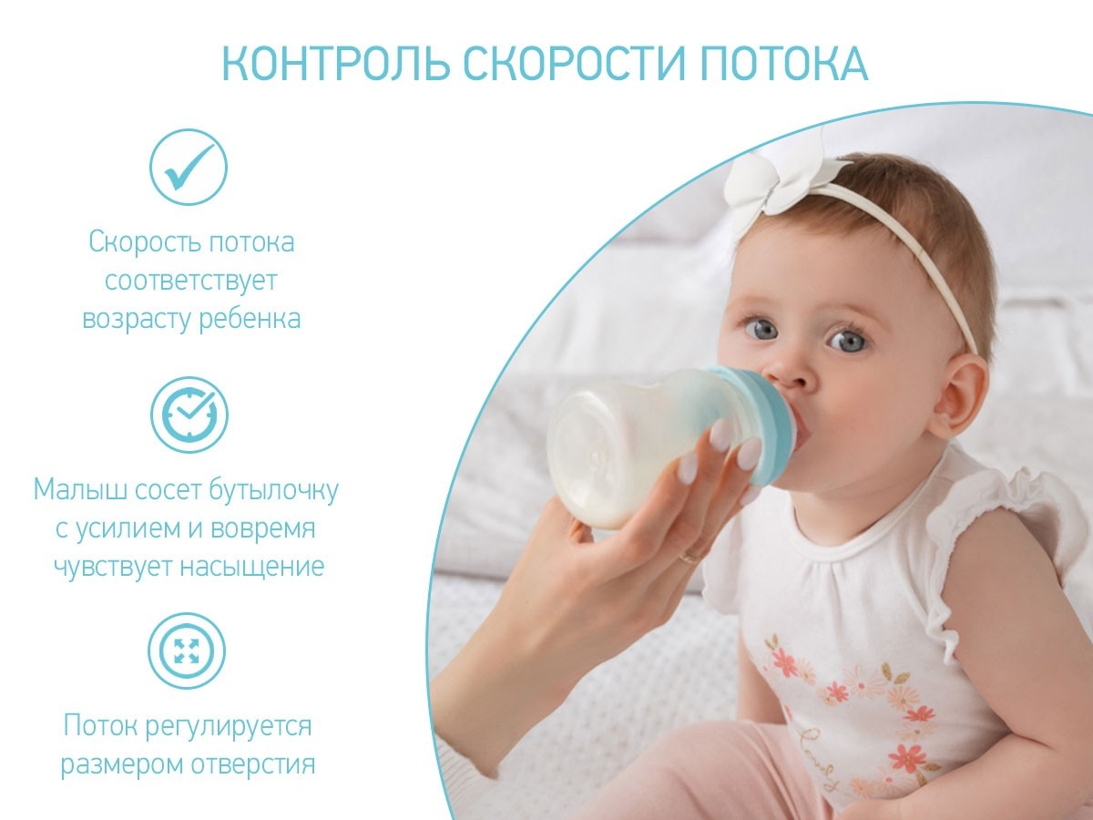 Бутылочка для кормления с силиконовой соской подходит детям от 3 месяцев. Анатомическое основание повторяет форму материнской груди, что позволяет сочетать искусственное и грудное вскармливание. Скорость потока регулируется размером отверстия и точно соответствует возрасту ребенка. Антиколиковый клапан предотвращает чрезмерное заглатывание воздуха и возникновения колик. Бутылочка имеет удобную для захвата форму. Маленький объем исключает возможность перекармливания. Разборная конструкция и широкое горлышко обеспечивают простой уход. Легкий корпус бутылочки сделан из полипропилена, поэтому ее можно стерилизовать кипячением. Выпуклая мерная шкала не стирается и позволяет использовать изделие в течение длительного срока.