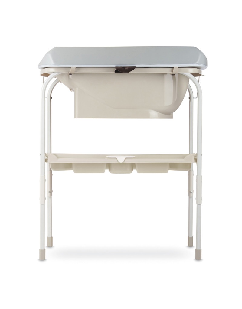 Пеленальный столик с прочной, легкой и компактно складывающейся алюминиевой рамой. Имеет полку с большим количеством места для хранения всех ваших принадлежностей для переодевания или купания. В комплекте ковшик, который помогает ополаскивать ребенка, не допуская попадания шампуня в глаза. Столик разработан с фиксирующими колесами, благодаря которым его удобно перемещать. Идеально подходит для пеленания и купания ребенка на оптимальной высоте для родителей.