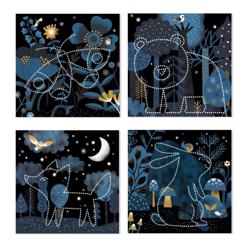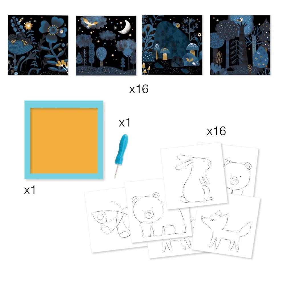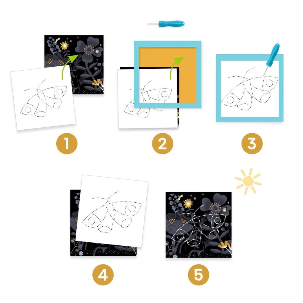 Выберите фон и животное, которое нужно открыть. Затем закрепите 2 листа в держателе. С помощью инструмента проделайте отверстия по точкам на шаблонах. Поместите источник света за фон: сюрприз — появится животное!