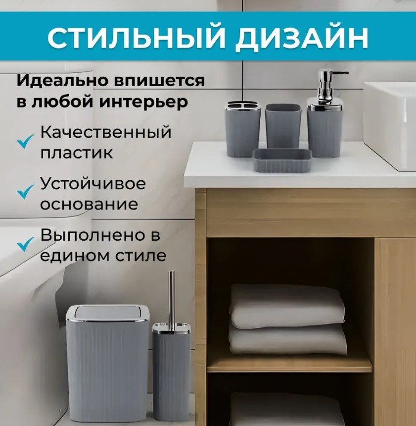 Особенностив наборе:дозатор для мыла 17.5x7.5 см, ершик для туалета 35.5x9.5 см, контейнер для мусора 22x19.5x24.3 см, мыльница 13x8.5x2.5 см, стакан для зубных щеток 7.5x7.5x11.5 см, дополнительный стакан 7.5x7.5x11.5 см