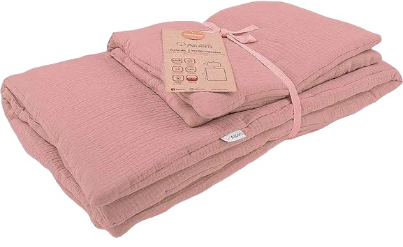 Одеяло и подушка имеют постоянно вшитый антиаллергенный дышащий нетканый материал, обеспечивающий комфорт и тепло во время сна. Он легкий и приятный в использовании, не теряет своей пушистости даже после стирки. Решение вшитого наполнителя означает, что в комплекте нет молнии, которая может раздражать кожу ребенка. Комплект постельного белья из муслина полностью стирается в стиральной машине, без потери свойств одеяла и подушки. Кроме того, это метод, позволяющий освежить весь набор, такое решение особенно рекомендуется аллергикам. Помимо гигиенических соображений, стоит отметить, что это решение очень практично и экономично. Это экономит время и деньги, нам не нужно покупать много наволочек, которыми потом приходится надевать одеяло и подушку.