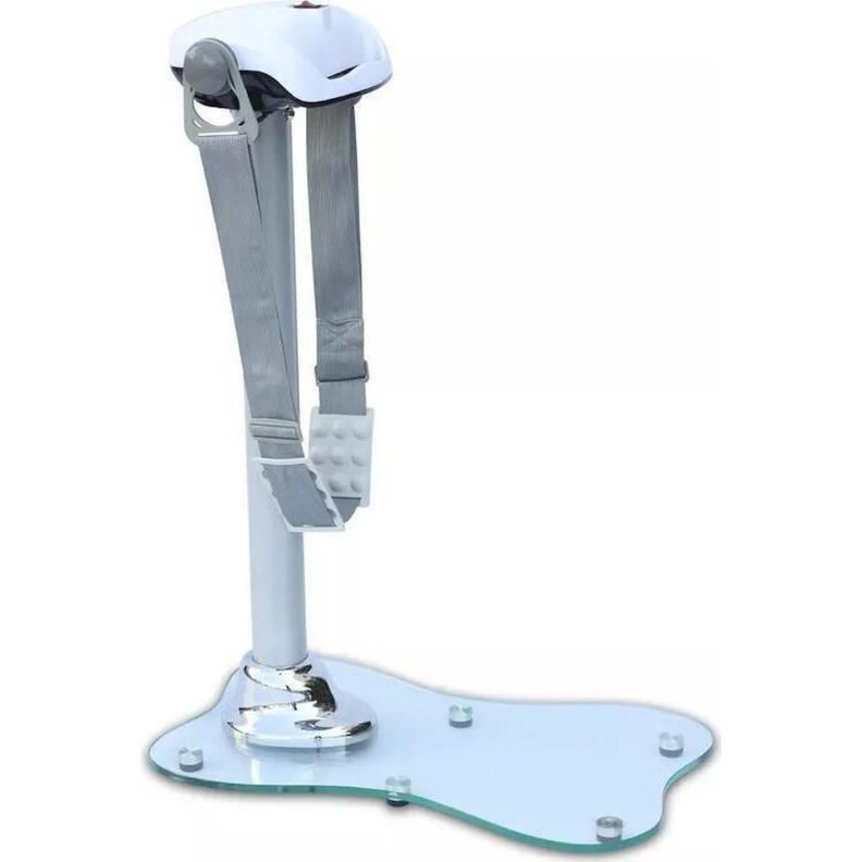 Конструкция включает прочную стальную стойку и платформу из закалённого стекла, способную выдержать вес пользователя до 120 кг.