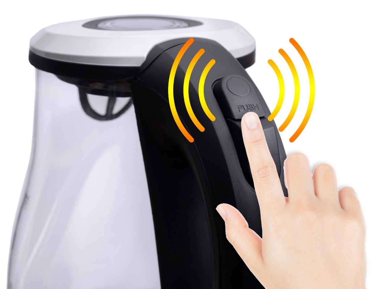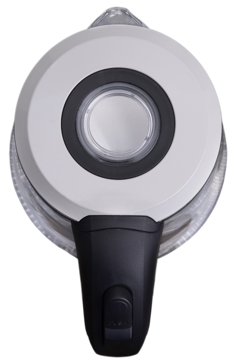 Стекло практичное в эксплуатации, позволяет отслеживать уровень воды в колбе. Крышка чайника легко открывается нажатием кнопки.