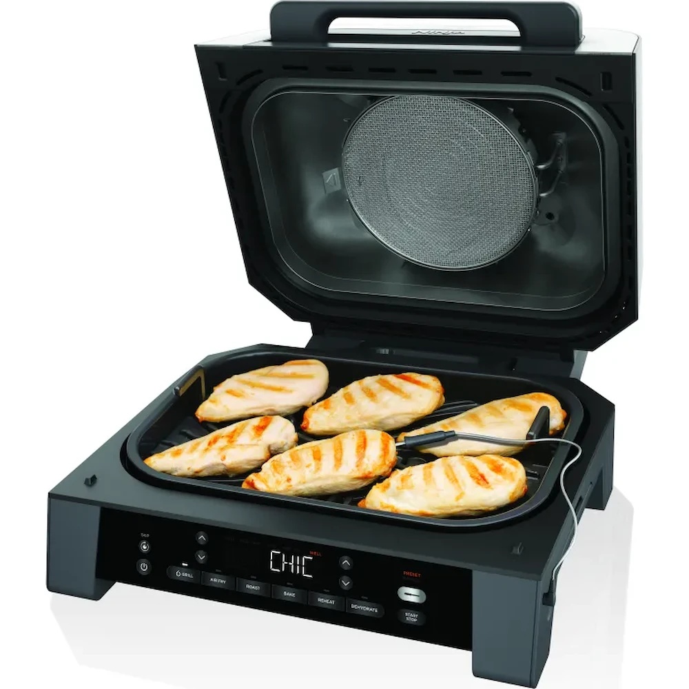 Устали от длительного приготовления еды и чрезмерного количества масла? Теперь можно готовить быстро, удобно и получать более здоровый рацион! Гриль Ninja Foodi MAX Air Grill & Air Fryer с Cooking probe DG551EU оснащен 6 функциями приготовления — жарка, гриль, дегидратация, запекание, аэрофритюр и разогрев. Даже новички смогут готовить вкусные блюда ресторанного уровня. Технология Cyclonic Grilling с горячим воздухом до 265°C равномерно обжаривает с хрустящей корочкой и насыщенным ароматом. А система Smart Cook и умный термощуп позволяют достичь идеального результата с 4 режимами для разных видов мяса и 9 уровнями прожарки. Снижайте потребление масла на 75% и получайте блюда с уменьшенной калорийностью. Приготовление замороженных блюд требует всего 25 минут с высокой мощностью 1760 Вт. Идеальная система контроля дыма позволяет оставлять кухню чистой, а керамическое покрытие легко очищается даже в посудомоечной машине. Добавьте приготовлению любимых блюд профессионального уровня с грилем Ninja Foodi MAX!