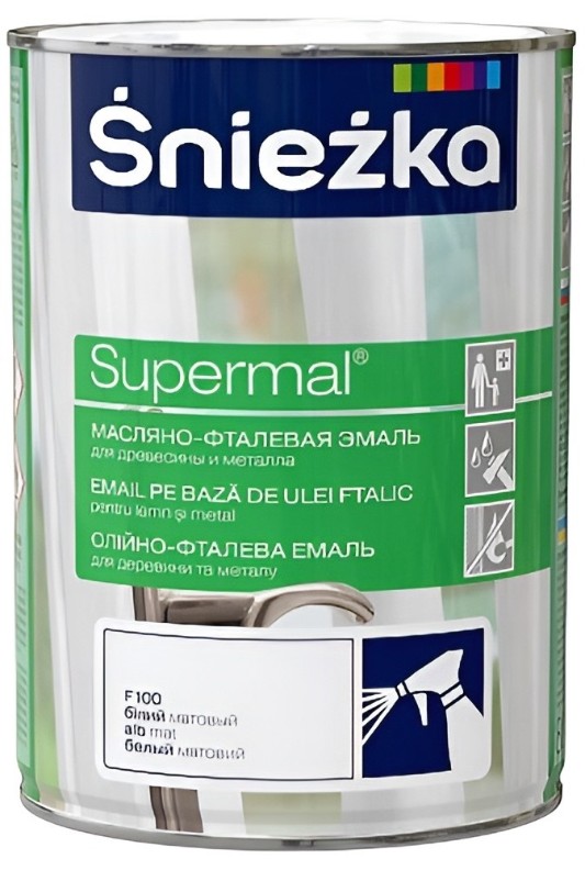 Эмаль масляно-фталиевая Supermal Sniezka предназначена для декоративной и защитной окраски деревянных поверхностей, древесных материалов (окна, двери, мебель), штукатурок и металла (ворота, заборы), эксплуатируемых как внутри, так и снаружи зданий.
