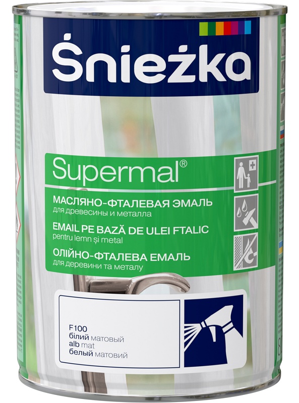 Применение: Масляная и фталевая эмаль SNIEZKA Supermal используется для декоративной окрашивание древесины, древопроизводных материалов, штукатурок, а также стальных и чугунных элементов, использующихся внутри и снаружи помещений, таких как: окна, двери, мебель, ограда и т.п. Рекомендуется для применения в строениях общественного предназначения, например, медицинских и образовательных учреждениях, а также в помещениях промышленной отрасли.