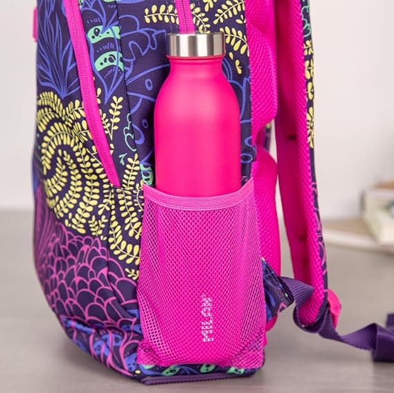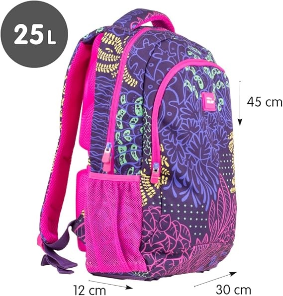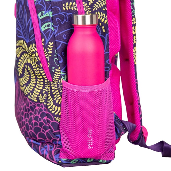 Школьный рюкзак с 2 молниями. Специальная серия Fireflies, принт, созданный из различных форм растительности и листьев, представляет среду, в которой живут светлячки. Цвета яркие, как свет светлячков: сиреневый, фуксия, желтый и зеленый, которые выделяются на фоне темно-сиреневой основы. Молнии и детали цвета фуксии. Один основной карман с защитным внутренним отделением для ноутбука и один передний карман. Два боковых сетчатых кармана для удобного доступа. Регулируемые ручки, мягкая и дышащая спинка, усиленное дно. Позволяет дополнить рюкзак тележкой. Состав ткани: полиэстер снаружи и внутренняя подкладка.