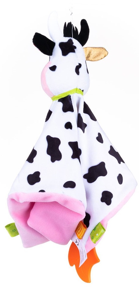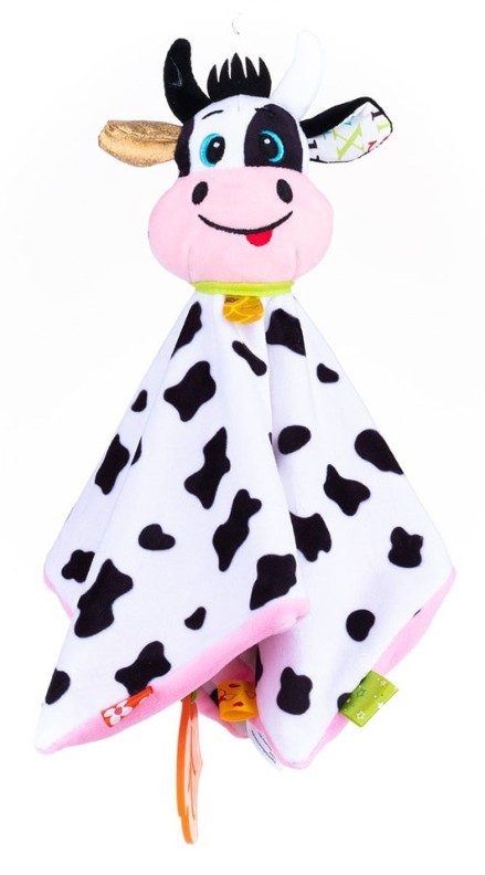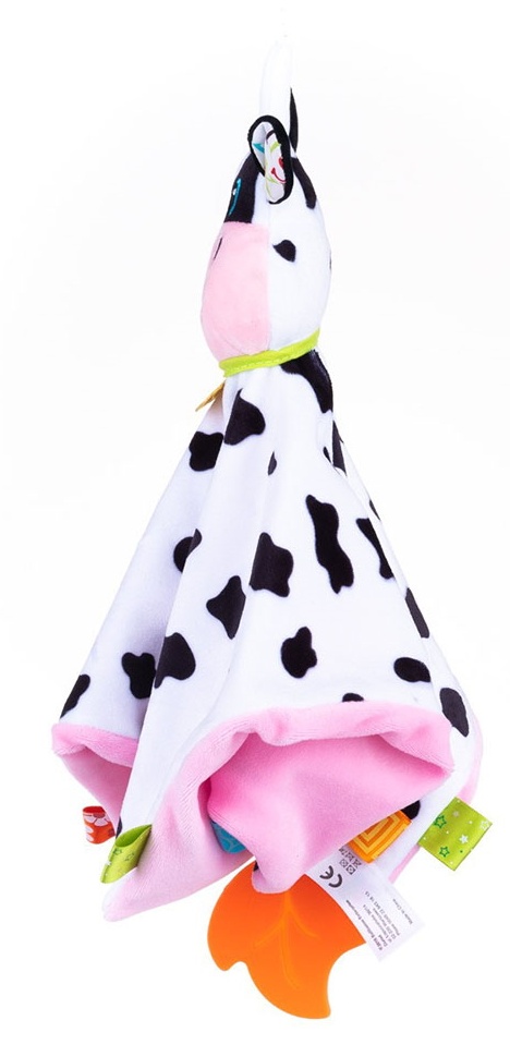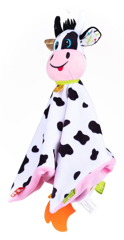Happy Cow предлагает множество развлечений! В его голове есть погремушка, а по бокам одеяла красочные метки с разной текстурой, стимулирующие осязание малыша. Мягкий прорезыватель в форме листочка облегчит прорезывание зубов малышам. При прикосновении уши коровки забавно шуршат. Игрушка предназначена для детей со дня рождения.