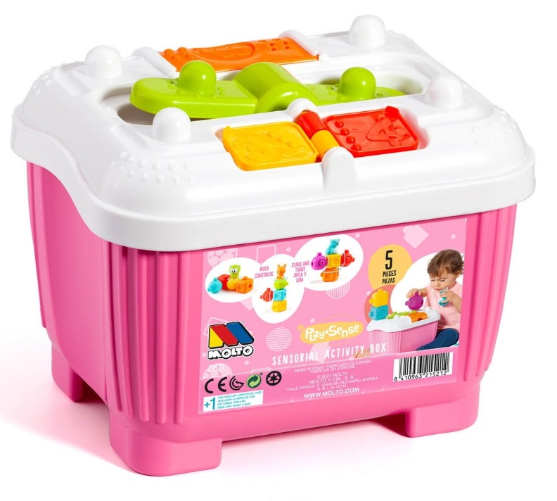 Розовая коробка для занятий с набором из 5 фигурок разных форм и цветов, не содержащих бисфенол-А, которые стимулируют сенсорное развитие ребенка благодаря своим разным текстурам, улучшают координацию рук и глаз, создавая их первые конструкции, так как фигурки подходят друг к другу, и играя, изучая разные цвета. Таким образом, малыш будет приобретать новые способности и навыки по мере приобретения новых моделей из серии Molto Play & Sense.