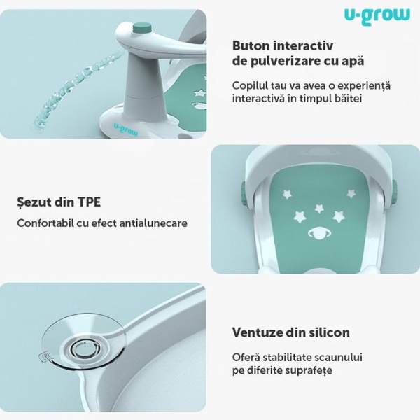 Стульчик для купания младенцев U‑Grow Green с ручкой и регулируемой спинкой создано для того, чтобы превратить купание в безопасный, удобный и веселый процесс.