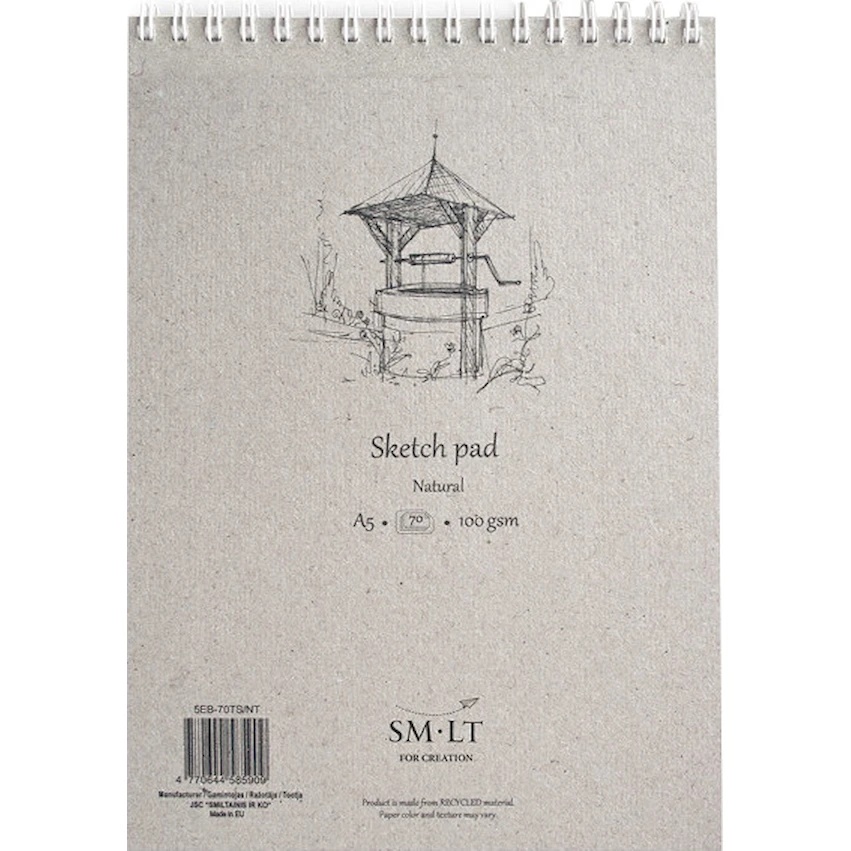 SMLT отлично подойдет для эскизов и рисунков в сухих техниках. Белые листы с перфорацией плотностью 100 гр./кв.м. надежно защищены плотной обложкой из переработанной бумаги, с задней стороны альбом оснащен подложкой из плотного картона, которую можно использовать в качестве планшета для рисования в любых условиях.
