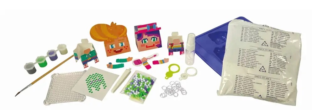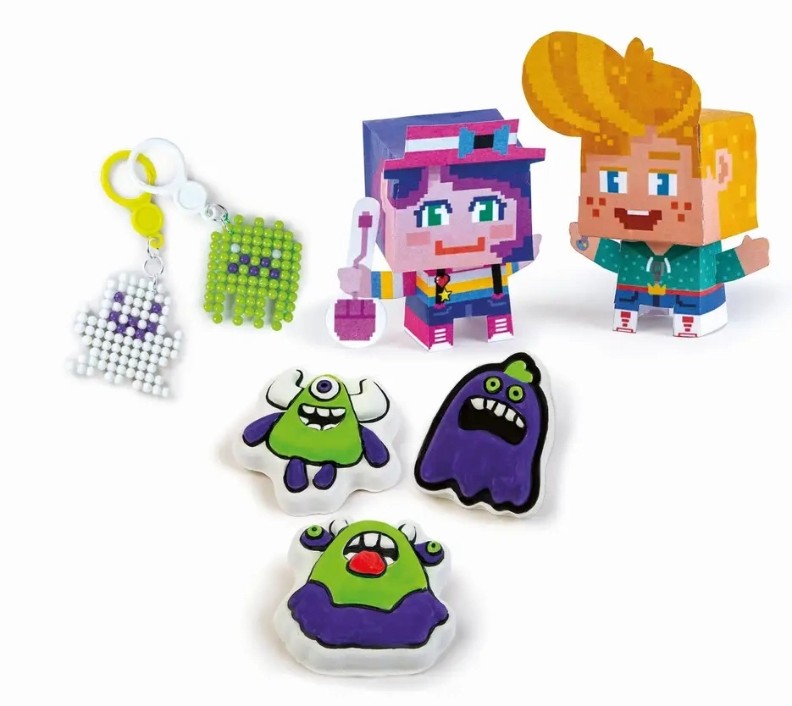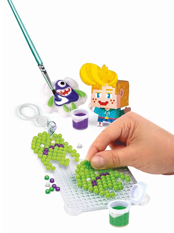 Коробка, полная сюрпризов, содержит всё необходимое для создания потрясающих украшений в стиле видеоигр! С Aquabeads дети могут сделать оригинальные брелоки — просто распылите на них воду и наблюдайте, как бусины волшебным образом склеиваются! Бумажные игрушки позволяют детям экспериментировать с картоном! Можно создать множество фигурок и использовать их, прежде чем отправиться в захватывающие приключения! Картонные карточки развлекают детей пиксельной графикой, одновременно обучая их программированию! Они также могут сделать уникальную подставку для маркеров, которую можно украсить наклейками из набора.