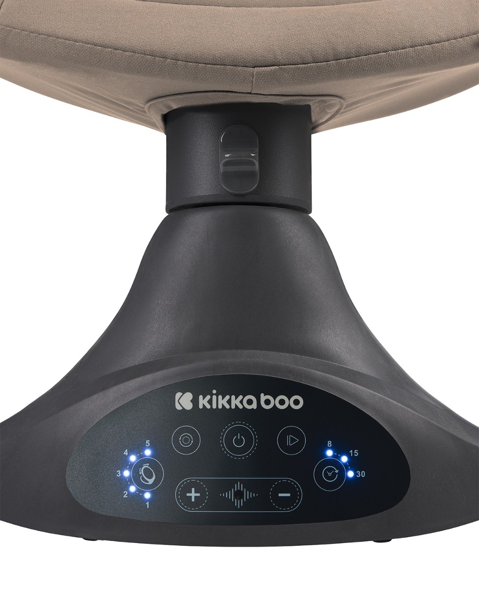 Легкая алюминиевая рама. Абсолютно бесшумное качание из стороны в сторону. 5-скоростная функция качания. Кнопка блокировки поворота. Сенсорный дисплей. Музыкальная панель с 10 мелодиями и регулировкой громкости. Таймер на 8, 15 и 30 минут. Регулируемая спинка. Съемный капюшон с противомоскитной сеткой и удлиненным солнцезащитным козырьком.