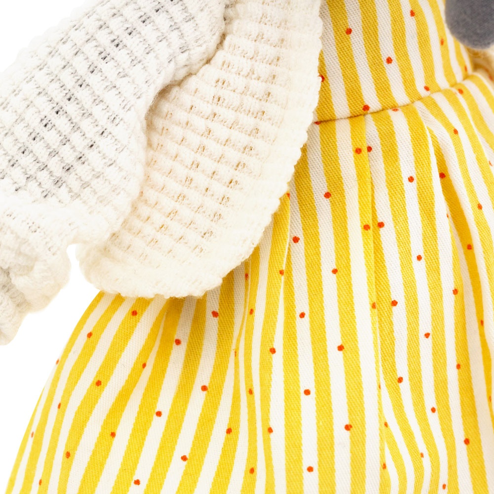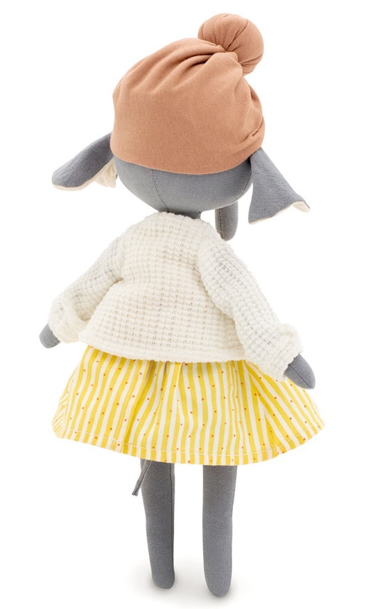 Слонёнок Элис - самая красивая из всех слоников на свете! Она очень любит наряжаться и придумывать необычные образы. Элис одета в яркое желтое платье и белую кофточку крупной вязки. На голове модный пудровый тюрбан. Одежда выполнена из 100% натурального хлопка и полностью съемная.